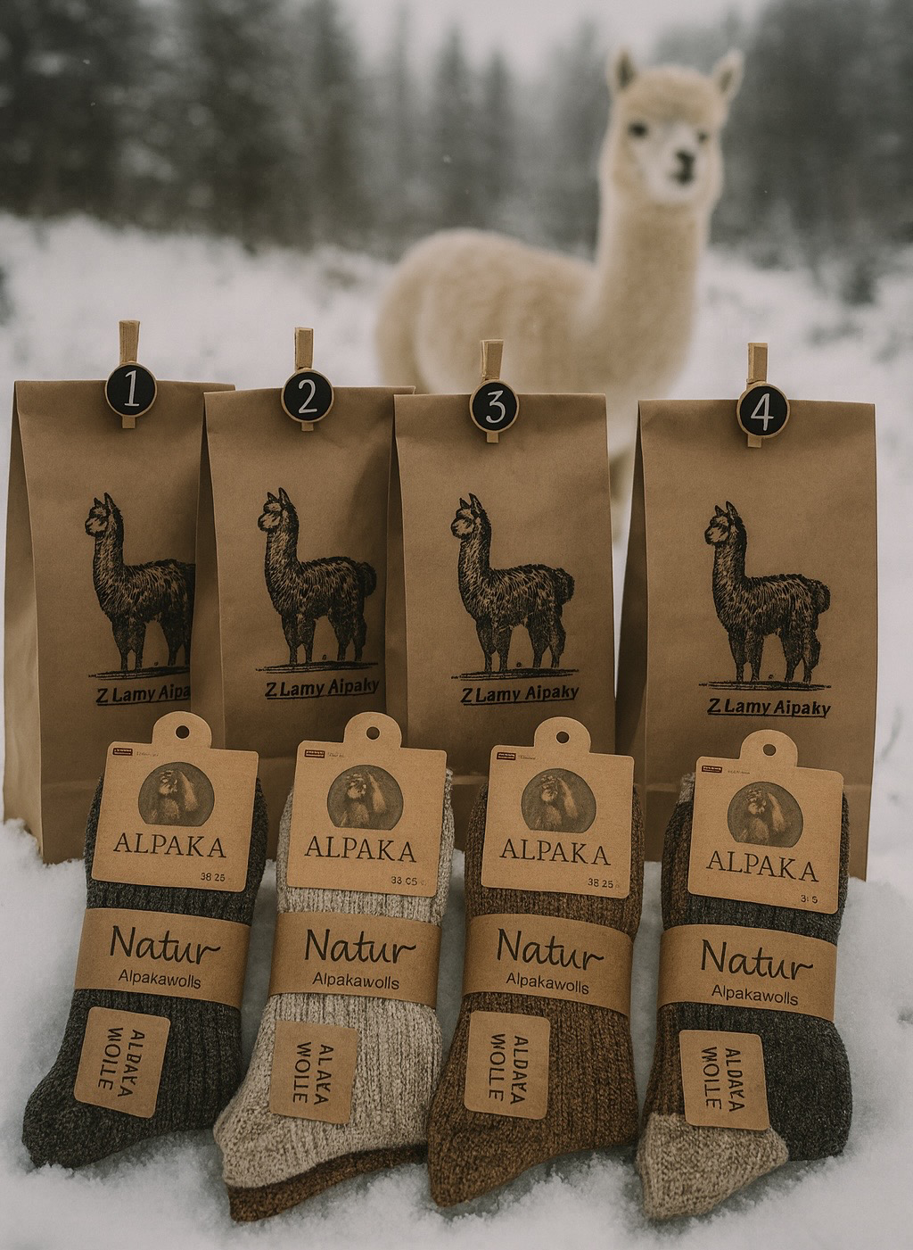 Jedinečný adventní kalendář z alpaka ponožek, který vznikl v Česku a nikde jinde na světě ho nekoupíte. Každý den od 1. do 24. prosince otevřete jeden přírodní kraftový pytlíček s motivem lamy/alpaky a uvnitř na vás čeká nový pár teplých ponožek z pravé alpaka vlny.