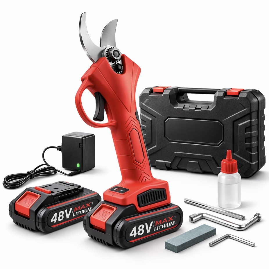 1 x nůžky1 x nabíječka2 x 48V li-ion baterie, 1,5Ah, 21V1 x mazivo2 x klíč1 x brousek na naostření1 x kufřík