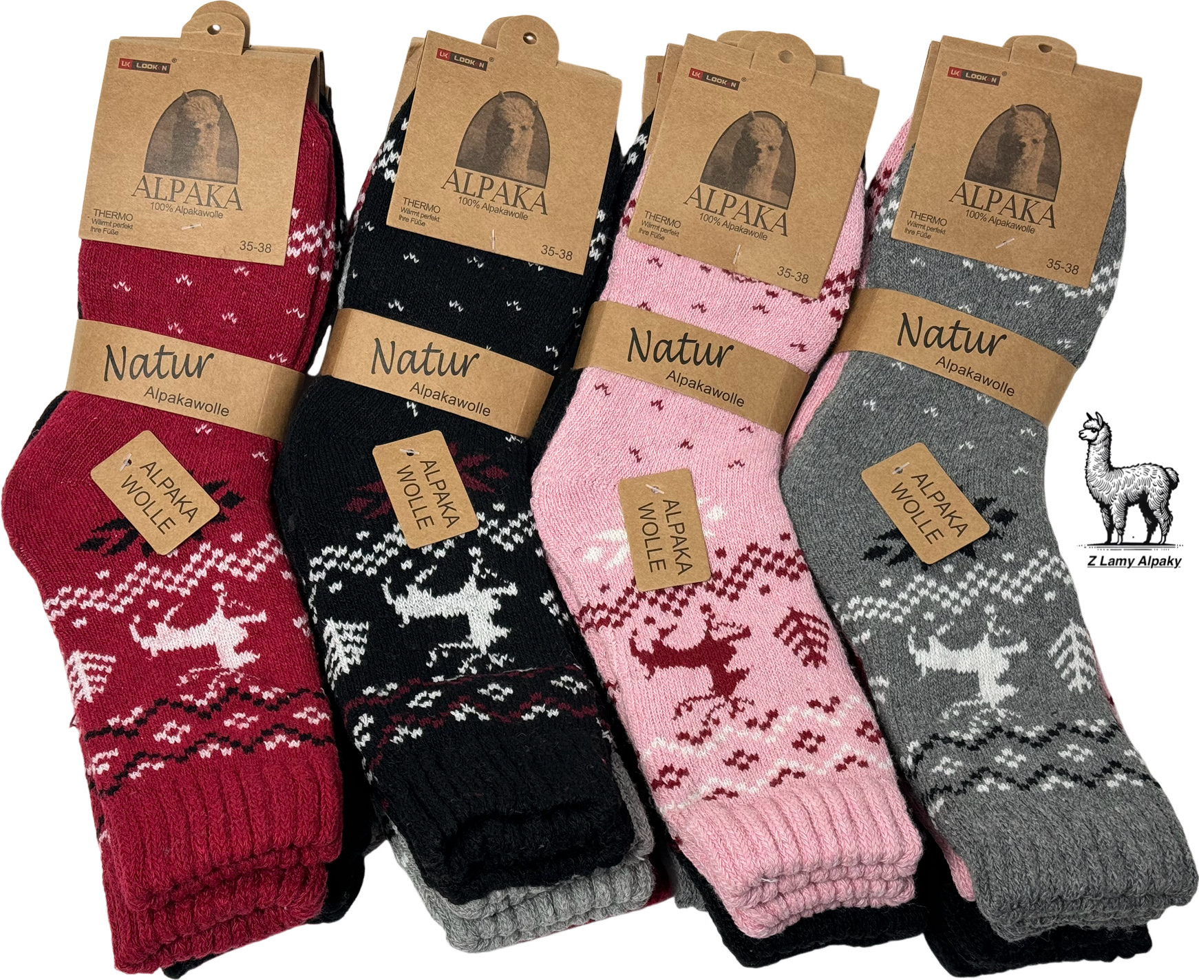 Teplé termo ponožky z alpačí vlny s vánočním vzorem sobů – měkké, hřejivé a stylové. Ideální pro zimní období, večery u krbu i venkovní aktivity. Materiál alpaka poskytuje přirozenou tepelnou izolaci a jemnost. Perfektní dárek nebo stylový doplněk pro každodenní nošení v chladném počasí.