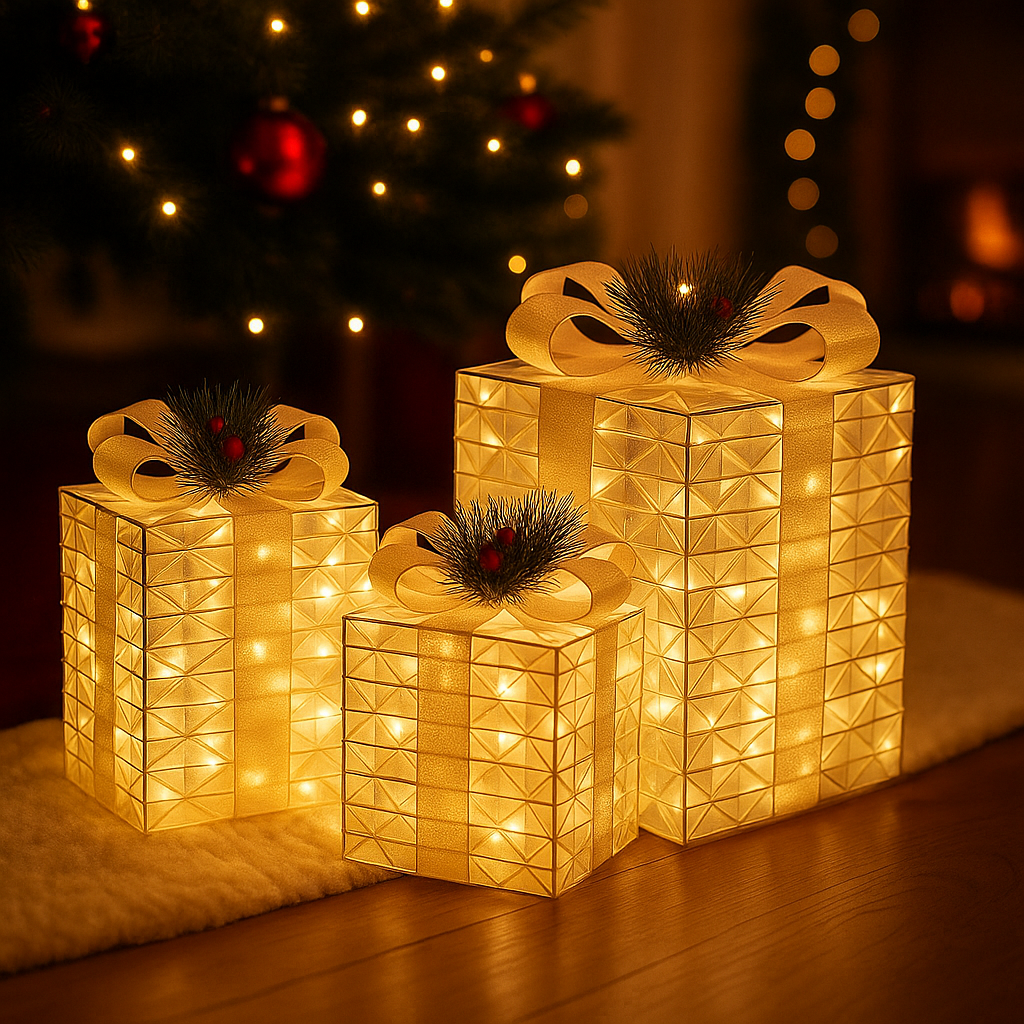 Tři elegantní holografické dárky s jemným světlem 120 LED promění každý kout v pohádkovou scénu. Díky krytí IP44 si je užijete v obýváku i venku na krytém místě – u vchodu, na terase nebo ve výloze. Stačí zapojit a nechat Vánoce začít.